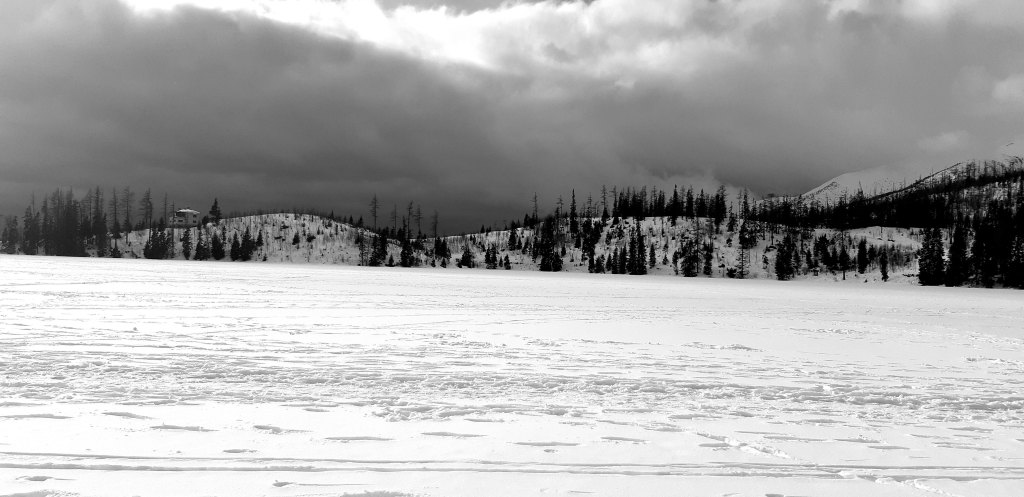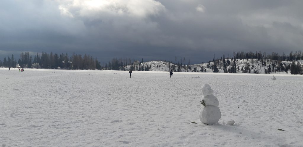 After lunch, we took another train to Štrbské Pleso. Is was colder than in Starý Smokovec. There was lot of snow in the city. We walked to a lake, we were expecting to see water but not at all. The lake was completely icy and covered with about 15 cm of snow. It was very very beautiful. A landscape in black and white.